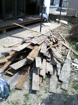 くぎが付いているものは抜きとります。板をはがす人、くぎを抜く人、板を運ぶ人に作業分担し、効率よく行います。