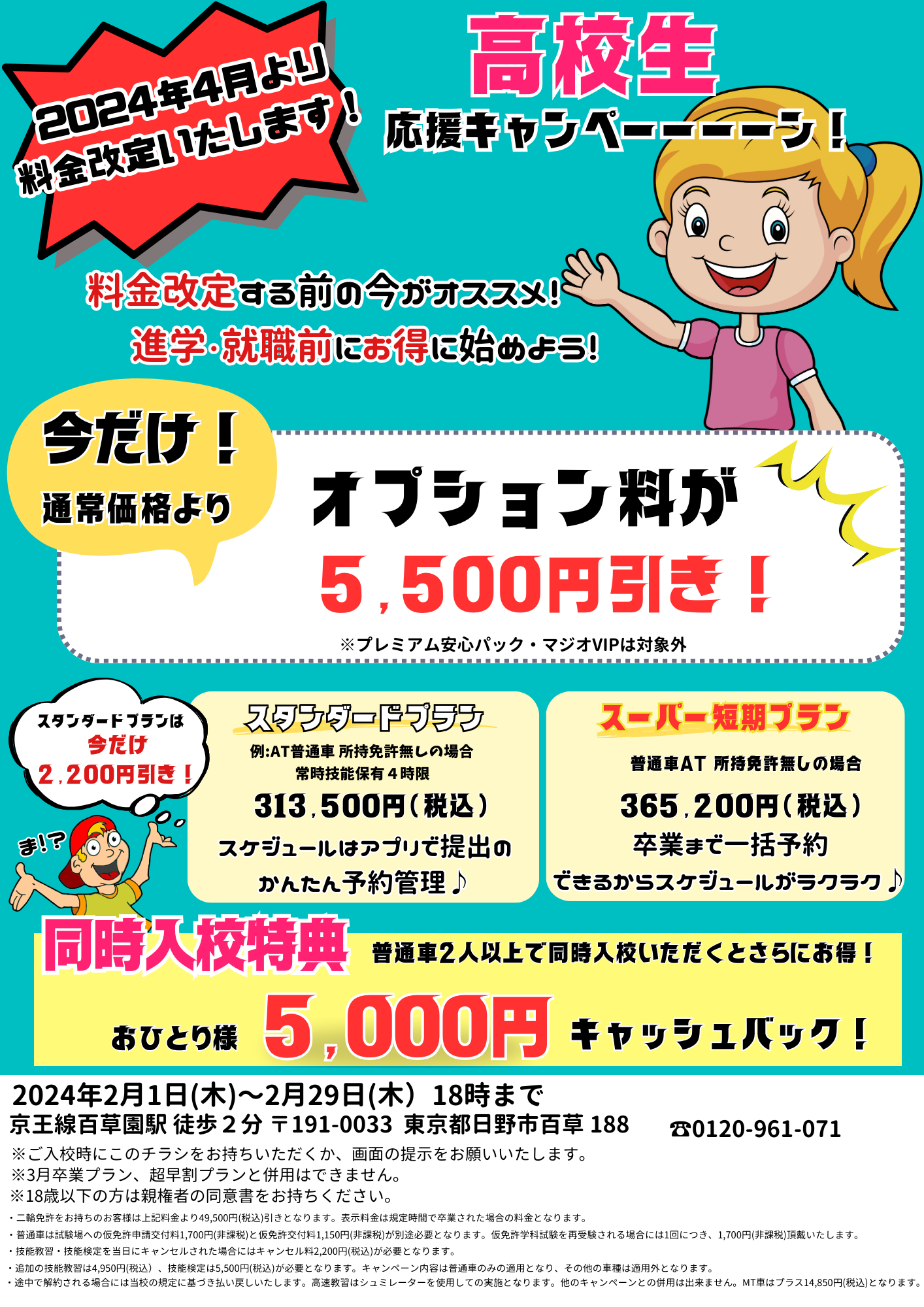 続・高校生応援キャンペーン! こんにちは🤗 1月に続いて2月も高校生特別キャンペーンを実施します! お得1 オプション料が5,500円引きです✨ 安心パックやスーパー短期、予約2倍が超お得になりますよ⭕️ お得2 スタンダードプランが通常より2,200円引き!! お得なこの機会にぜひマジオに入校して一緒に教習を始めましょーーヽ(´▽`)/ 皆様のご入校をお待ちしております🎵 2024年1月29日