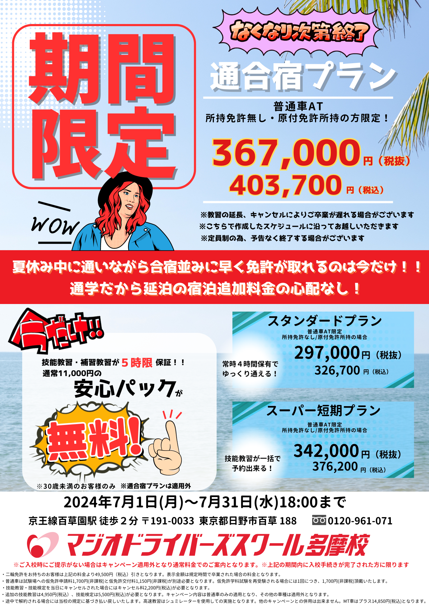 7月キャンペーン情報 7月は大変ご好評いただいております通合宿プランを期間延長で販売いたします! 残り枠が少なくなってきましたので、ぜひお問い合わせくださいませ。 また7月限定! 技能教習が5時間保証の安心パックが無料!(30歳未満のお客様適用) 通常11,000円のオプションですので、大変お得です!!ぜひご検討くださいませ💁♀️ ※通合宿プランのお客様は安心パック無料キャンペーン適用外になります 引き続き、体験教習も毎日実施しておりますのでぜひお問合せください! 2024年6月21日