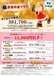 12月キャンペーン 今年最後のキャンペーンは超最速卒業プランと 11,000円引きで超お得◎ 決まったスケジュールで来てもらう超最速卒業プランは予定が合えば年末もしくは年明けに卒業ができます! 数量限定なので、お早めにお越しくださいませ✨ またその他のプランのお客様も通常料金よりなんと11,000円引きだから入校するチャンス👍 ぜひお得なこの機会に入校しましょう! 2024年11月29日