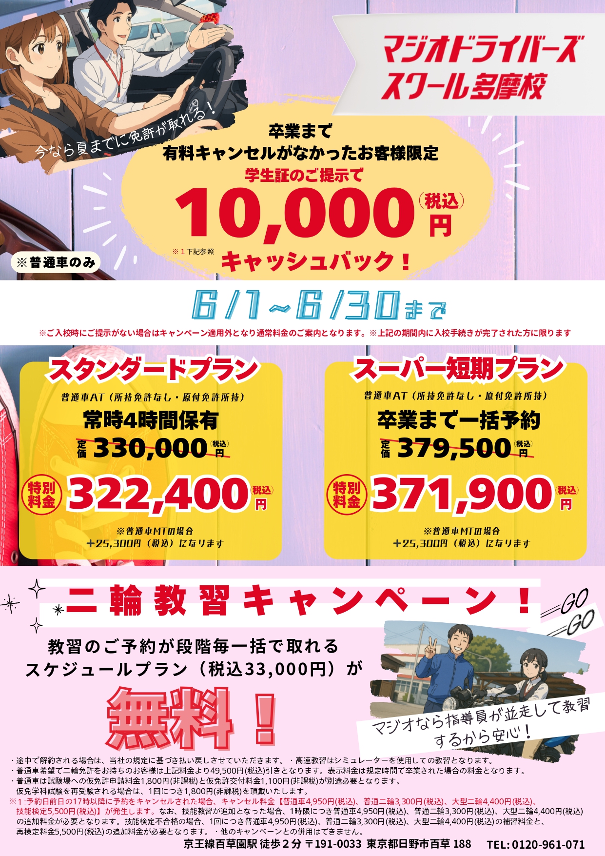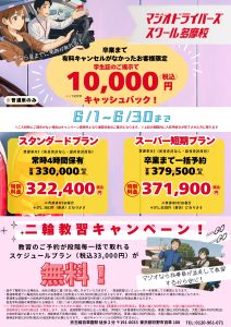 また普通車の技能教習・有料キャンセルが卒業までなければ、なんと!卒業時にお祝い金として10,000円のキャッシュバック!!