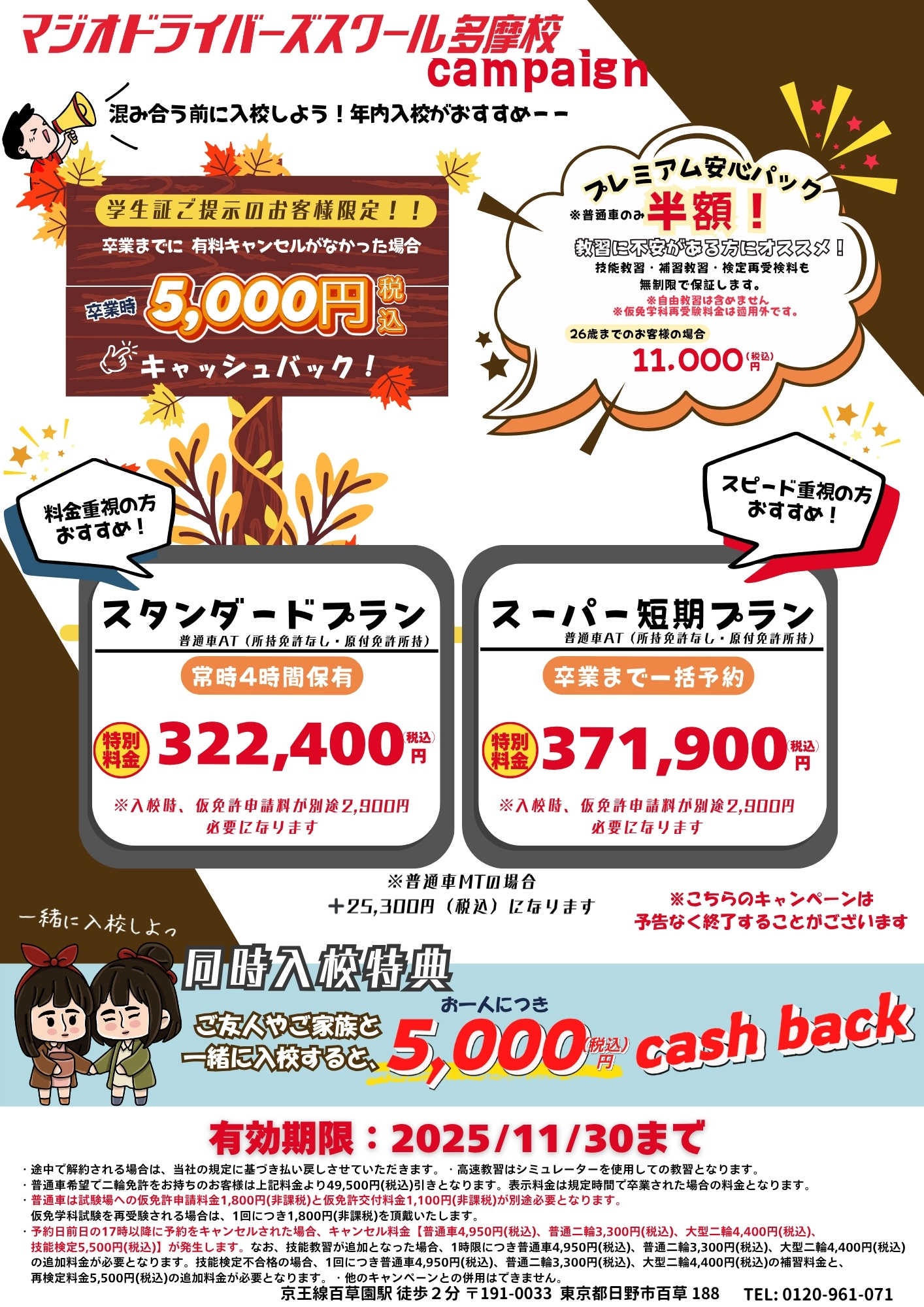 定価より割引+卒業まで有料のキャンセルがなければ、お祝い金として卒業時5,000円のキャッシュバック!!