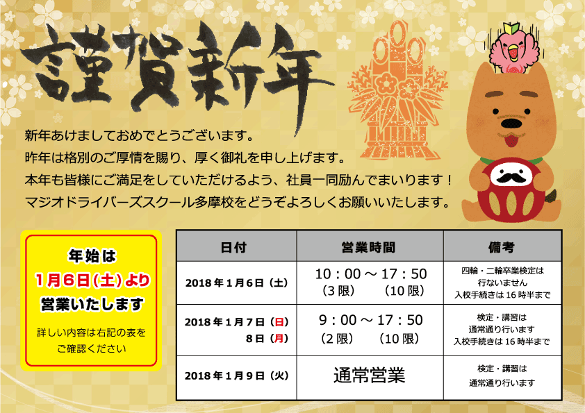 【重要】年始の営業について 皆さん、新年あけましておめでとうございます! 新年の営業につきましては、以下の通りとなります。 本年もマジオドライバーズスクール多摩校をよろしくお願い致します。 2018年1月1日