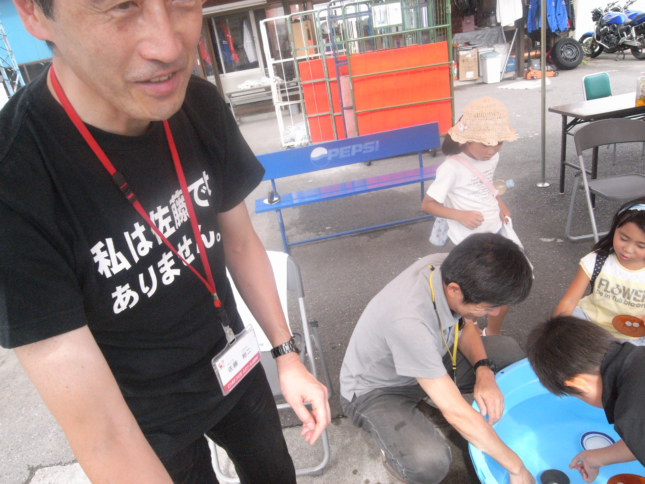 『私は佐藤ではありません』Tシャツ来ているのは、『コイン落とし』ブース担当の佐藤指導員!