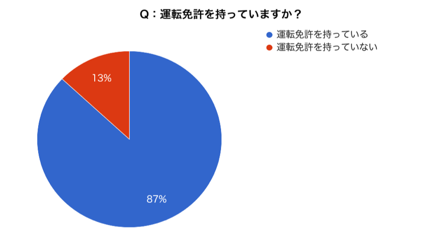 運転免許を持っていない方も、13%いらっしゃいました。免許を持っていないのは、東京や大阪、京都といった公共機関が充実した場所に住んでいる方が多くなります。自宅から歩ける距離に駅があり、車にあまり興味がない場合は、それほど免許の必要性を感じないようです。