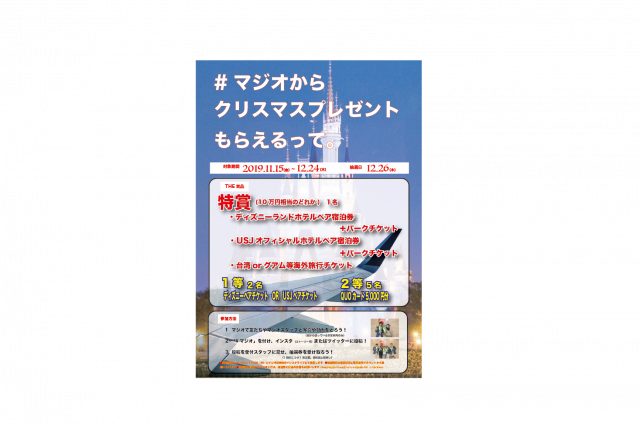 マジオクリスマスフライヤーイベントについて 2019.11.14 マジオネット全体の素敵なイベント「マジオクリスマスフライヤー」が開催されます。 詳細はロビー等に告知してありますので、そちらを参照ください。